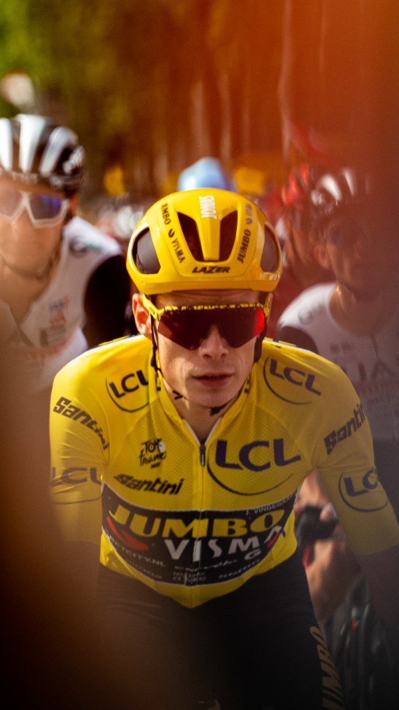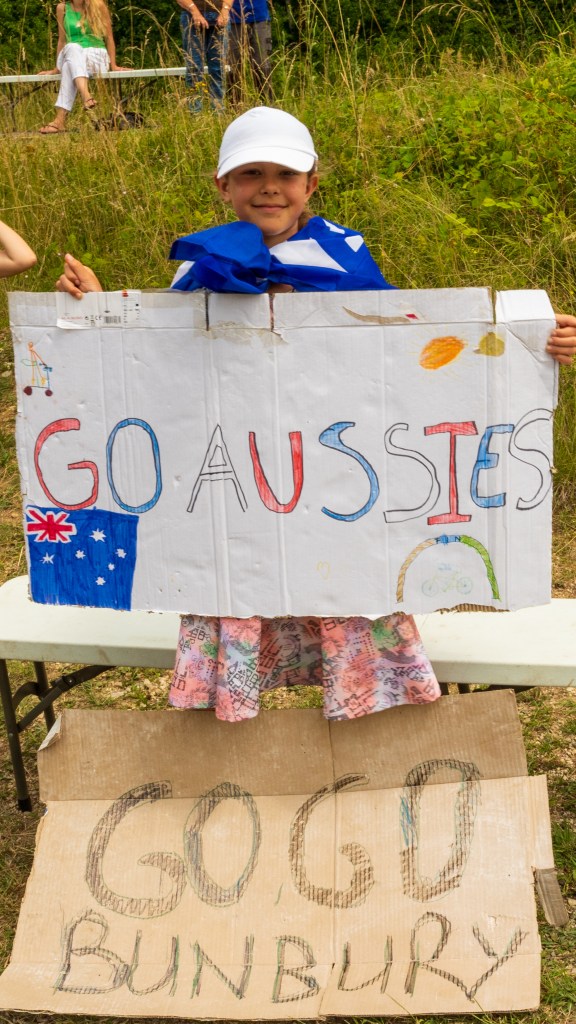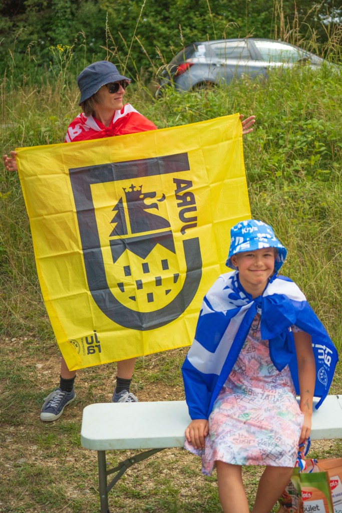 The second stop was Crotenay, which turned out to be another beautiful town. There were a ton of fans along the roadside coming out of town. I chose a position across from two rabid Yorkshire fans who had outfitted their van for a trip across France. The photo of Tom Pidcock coming past the van couldn’t have been more fitting.