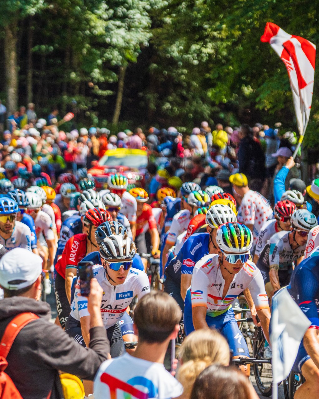 Today was a two stop day. After the nightmare at the top of Courchevel, there was no chance we were shooting the finish, especially because we had a TGV to catch out of Strasbourg later in the evening. That made the decision easy: shoot the climb up Balloon d’Alsace and then race over to the Petit Ballon to shoot the penultimate Cat 1 climb. Easier said than done. The road book made it pretty clear, gun it to Wasserbourg and then hope to god that the map was correct and the road actually exists. Yes, the road exists… no, we werent on it. In fact, we were on this tiny, half lane goat path in the Alsace… gunning it up a mountain on a rocky road in an Audi Q2. The distant cheers and cowbells were an indication we were in the generally correct place, but there was zero indication that the road we were on led to the world’s largest sporting event. Don’t believe me? Go read Jered Gruber’s post from Stage 20. Essentially the same thing happened to him and he’s been doing this for a decade.