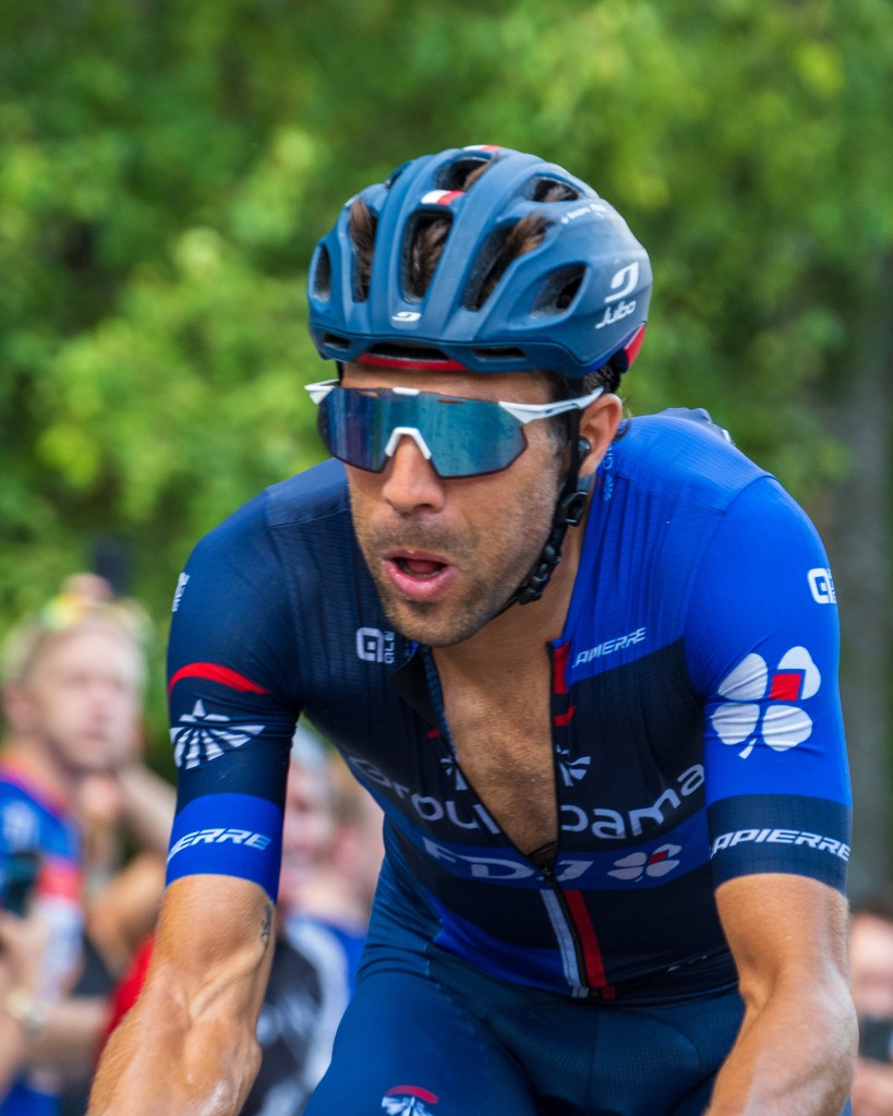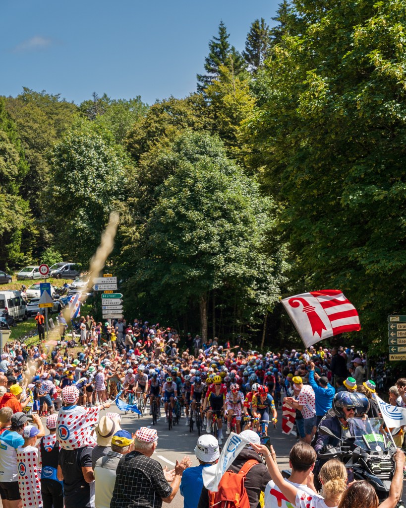 The atmosphere on Petit Ballon was solely focused on Thibaut Pinot. Guess who appeared in the viewfinder first? You got it. Pinot. Trademark grimaces and all. I love the panache. I’ll miss this guy.