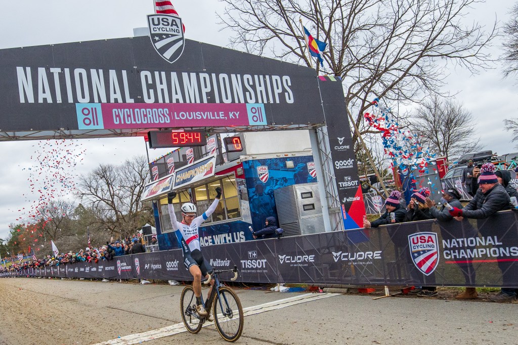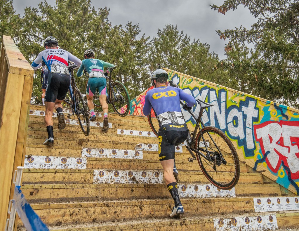 Sunday brought some cold, cold weather, but was generally dry. The U23 riders went off early, followed by the elites in the afternoon. After losing control of the track in 2018, the race organizers took a more muted approach to the Louisville venue in 2023. Unfortunately, that made it kind of boring. There was one wooded section with some hilly switchbacks, but otherwise just a bunch of generally flat, crit-like sections.